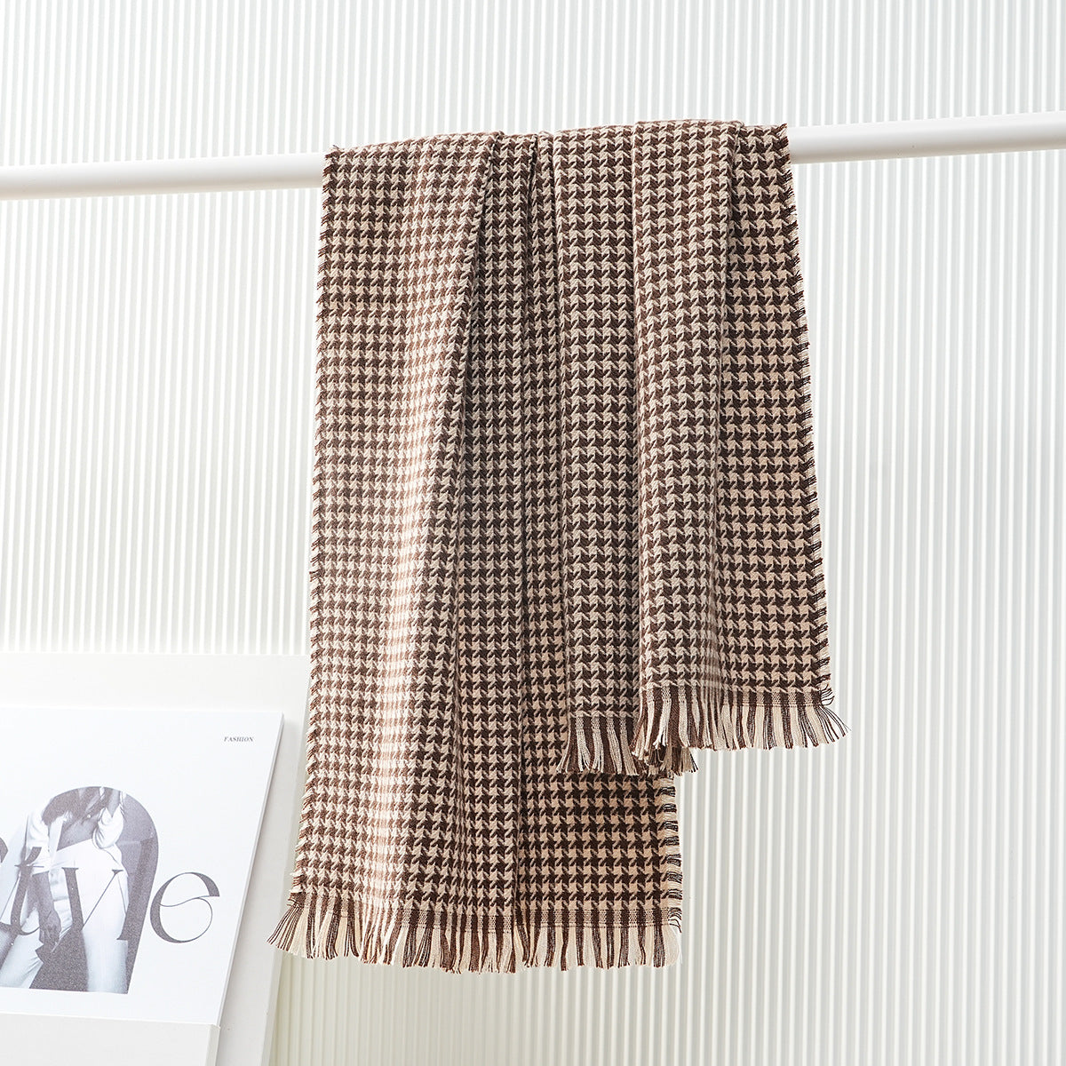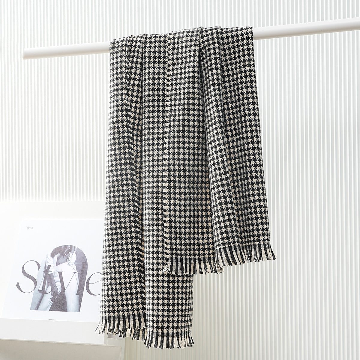 This luxurious scarf is a must-have for the autumn and winter seasons. Featuring a stylish houndstooth pattern, it will keep you warm and cozy while adding a touch of elegance to any outfit. Made with high-quality materials, this scarf is both fashionable and functional.