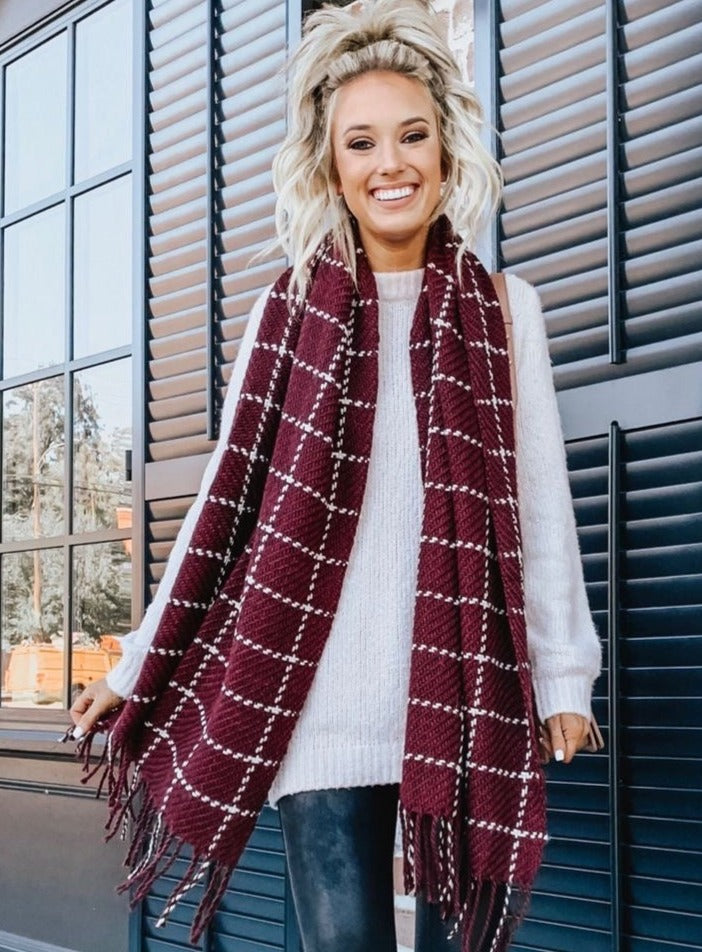Dale vida a cualquier look con esta elegante bufanda de punto grueso con cuadrícula. Su diseño rectangular y su llamativo color burdeos la hacen perfecta para otoño e invierno. Su tejido suave y ligero es ideal para un fin de semana informal, abrigada sin sacrificar el estilo.