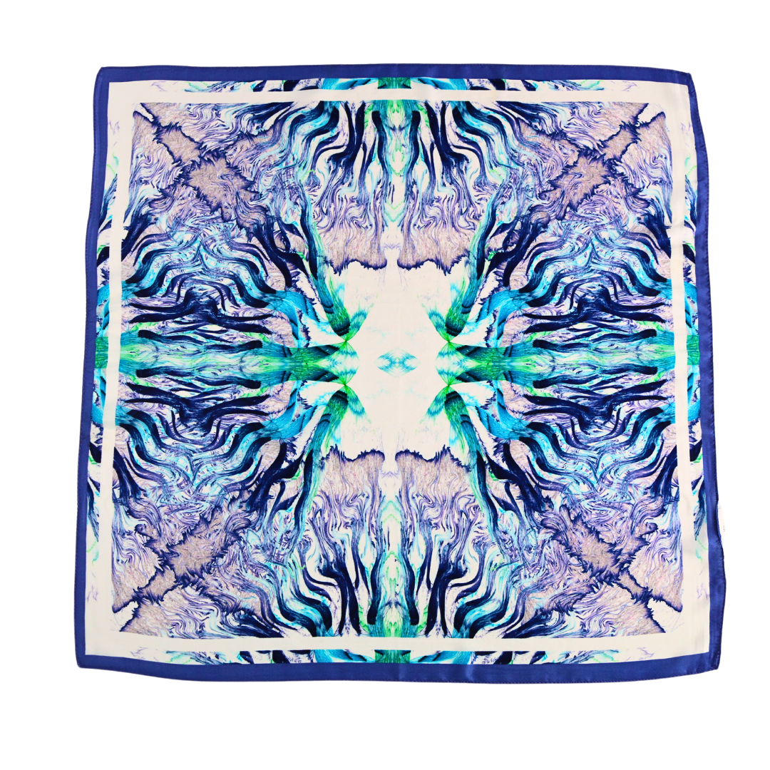 遊び心のあるブルーとグリーンのシルクバンダナスカーフで、ワードローブに彩りを添えましょう。上質なシルクで仕立てられたこのスカーフは、どんな装いにもマッチし、遊び心とエレガントさを添えてくれます。(もう退屈なスカーフとはおさらば!)
